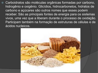 O documento discute carboidratos, lipídios e colesterol. Carboidratos incluem açúcares simples como glicose e frutose, e polímeros como amido e celulose. Lipídios incluem gorduras, óleos e fosfolipídios que formam membranas celulares. O documento também diferencia entre LDL "ruim" e HDL "bom", que transportam colesterol no sangue.