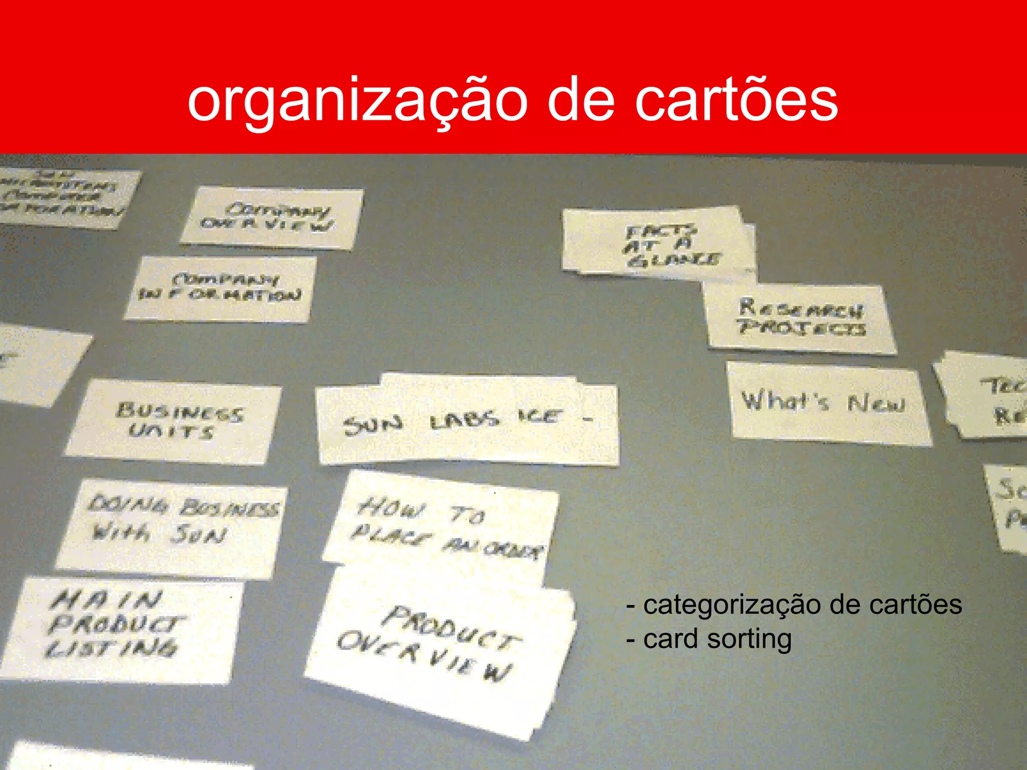 O documento discute a técnica de card sorting, usada para entender como usuários categorizam informações. Explica que envolve agrupar cartões representando tipos de conteúdo e pode ser aberta ou fechada. Também discute amostras, procedimentos, análises qualitativas e quantitativas dos resultados para refinar a taxonomia de um site.