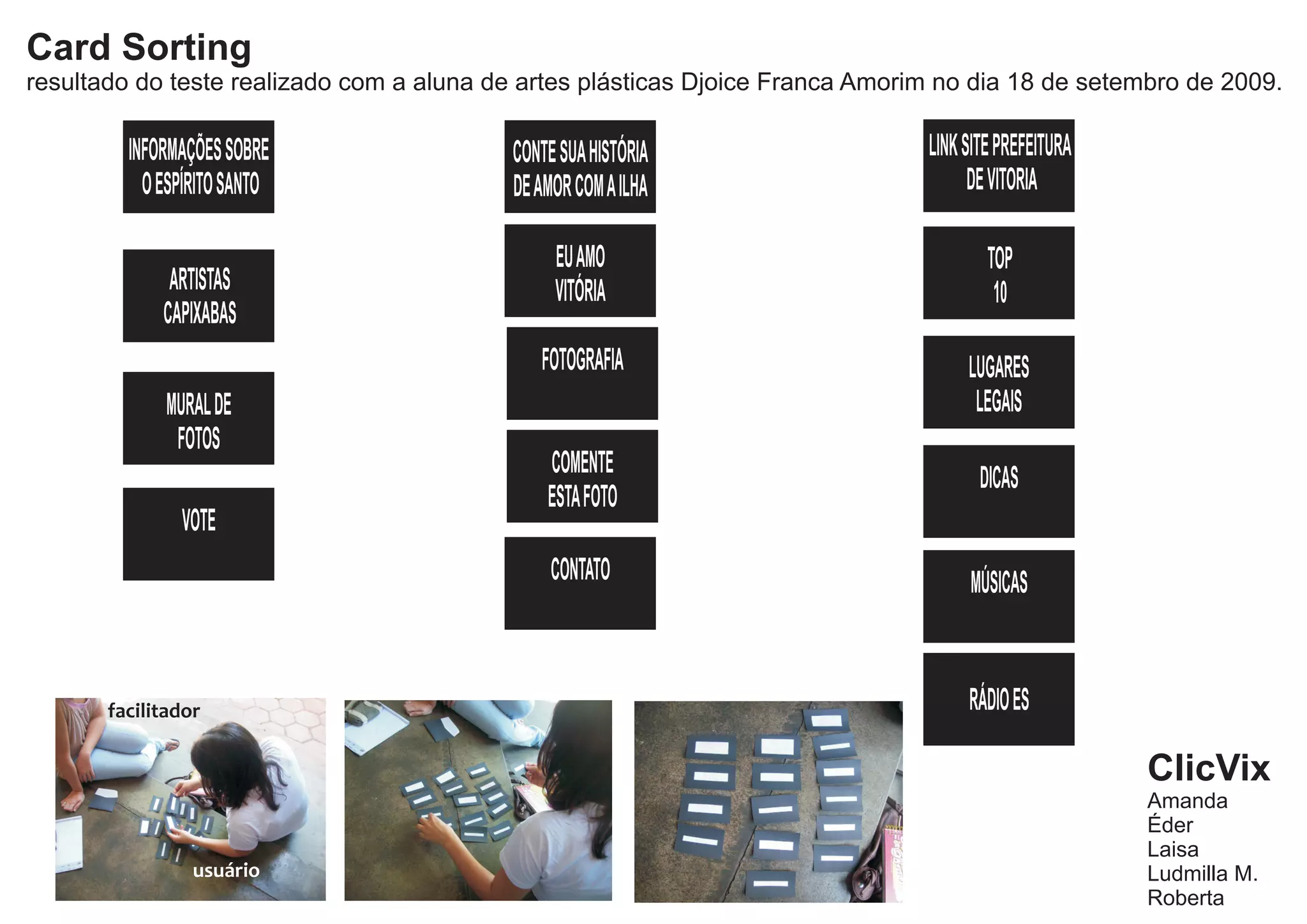 A aluna de artes plásticas Djoice Franca Amorim realizou um teste de organização de cards em 18 de setembro de 2009, classificando cards em categorias como "Informações sobre o Espírito Santo", "Artistas Capixabas", "Comente esta foto" e "Contato", auxiliada por um facilitador.