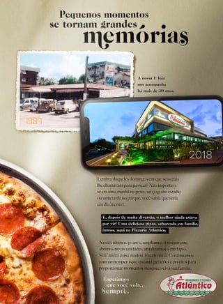 O documento lista vários pratos de um restaurante, incluindo entradas, saladas, massas, carnes e pizzas. As entradas variam de brusquetas a carpaccio de carne. Há diversas opções de saladas, como salada Waldorf com salmão. Nas massas, destacam-se lasanhas e fetuccines com diferentes recheios. As carnes incluem frango, peixe, camarão e filé mignon. Por fim, as pizzas trazem sabores tradicionais como calabresa e portuguesa.
