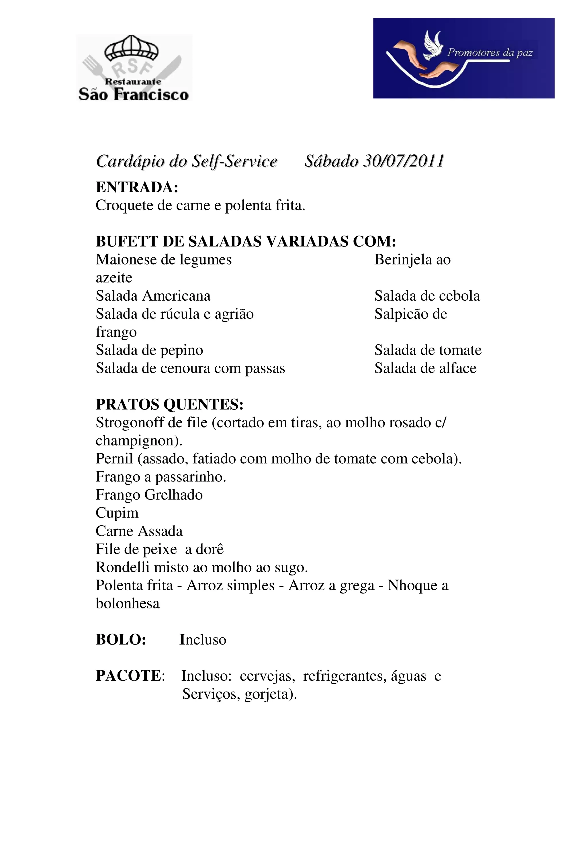 Cardápio do Self-Service Sábado 30/07/2011