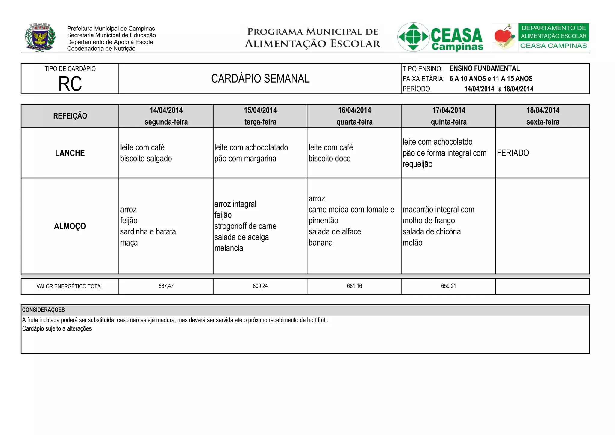 O cardápio semanal de 14 a 18 de abril para alunos de 6 a 15 anos inclui refeições como arroz, feijão e sardinha na segunda, arroz integral e feijão na terça, strogonoff de carne na quarta, macarrão com molho de frango na quinta e feriado na sexta. As frutas podem ser substituídas e o cardápio está sujeito a alterações.