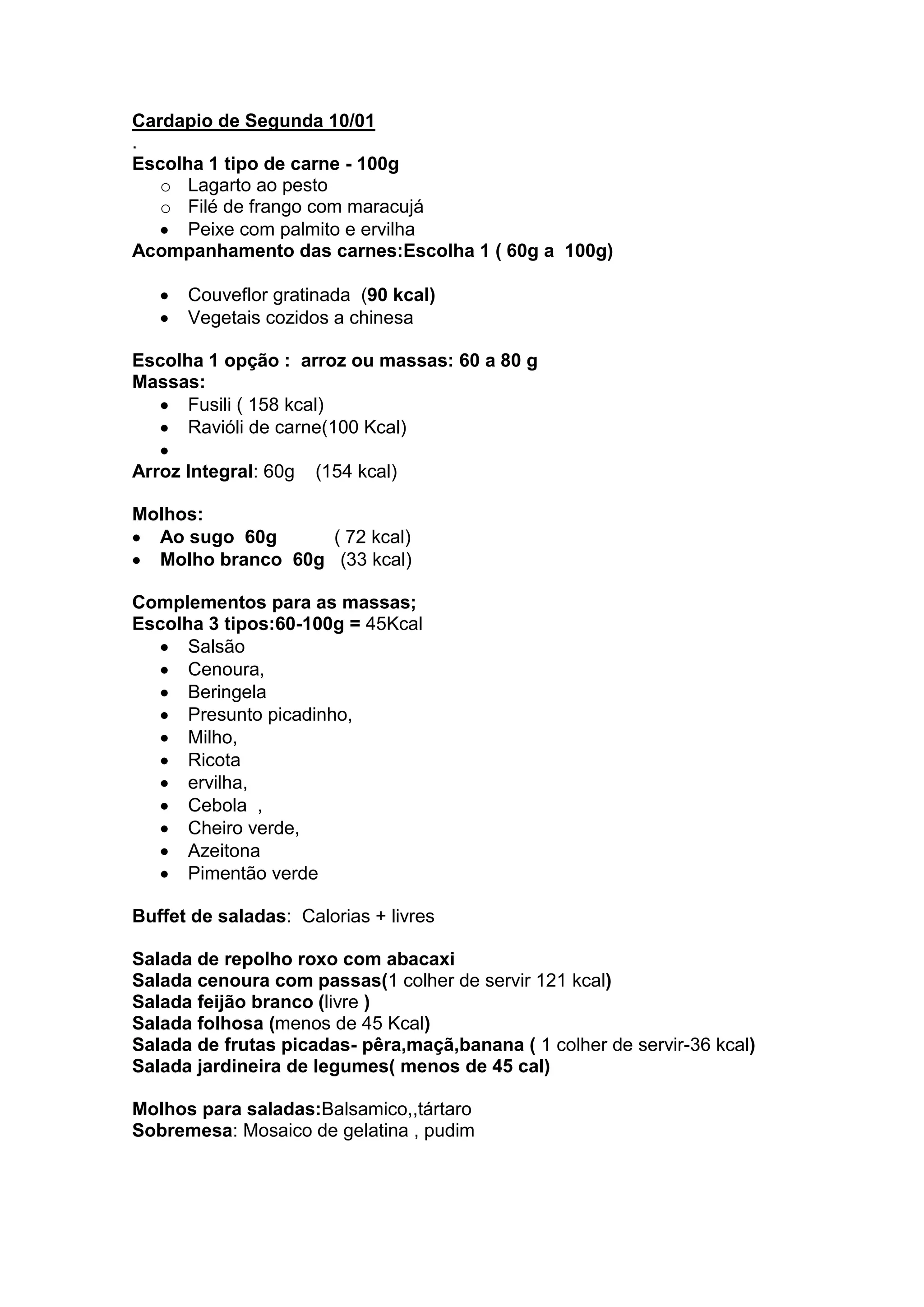 Os cardápios fornecem opções de pratos para cada dia da semana, incluindo carnes, acompanhamentos, arroz ou massas, saladas e sobremesas. As porções são balanceadas em termos de calorias e nutrientes.