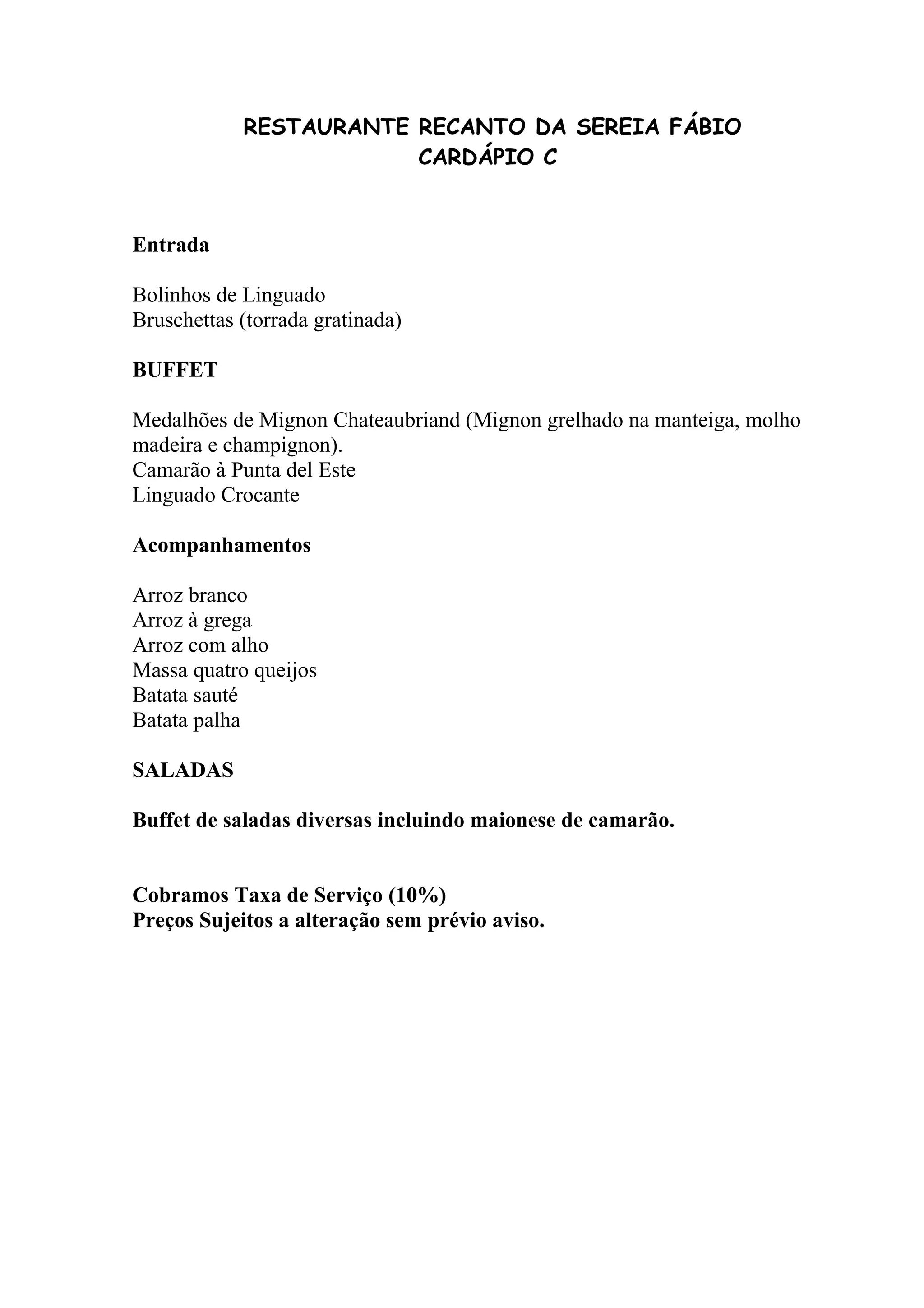 O cardápio do Restaurante Recanto da Sereia Fábio inclui entradas como bolinhos de linguado e bruschettas, pratos principais como medalhões de mignon, camarão à Punta del Este e linguado crocante, acompanhamentos como arroz branco, arroz à grega e batata palha, e um buffet de saladas diversas incluindo maionese de camarão. O restaurante cobra uma taxa de serviço de 10% e informa que os preços estão sujeitos a alterações.