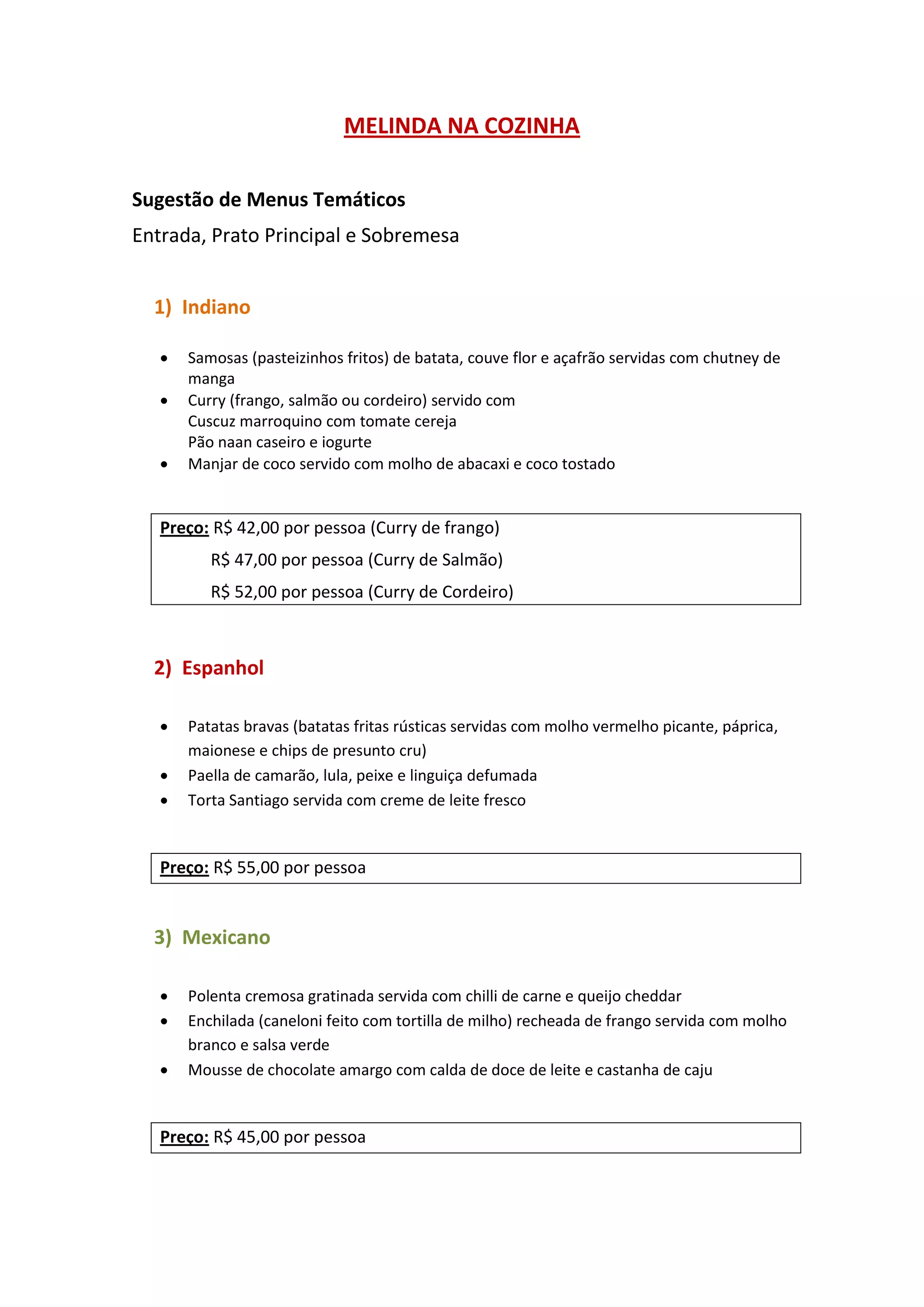 O documento lista 10 menus temáticos para eventos com sugestões de entrada, prato principal e sobremesa inspirados em culinárias indiana, espanhola, mexicana, italiana, inglesa, grega, francesa, americana, brasileira e russa. Cada menu inclui o preço por pessoa e observações sobre pagamento, antecedência para preparativos, número de atendentes e limpeza após o evento.
