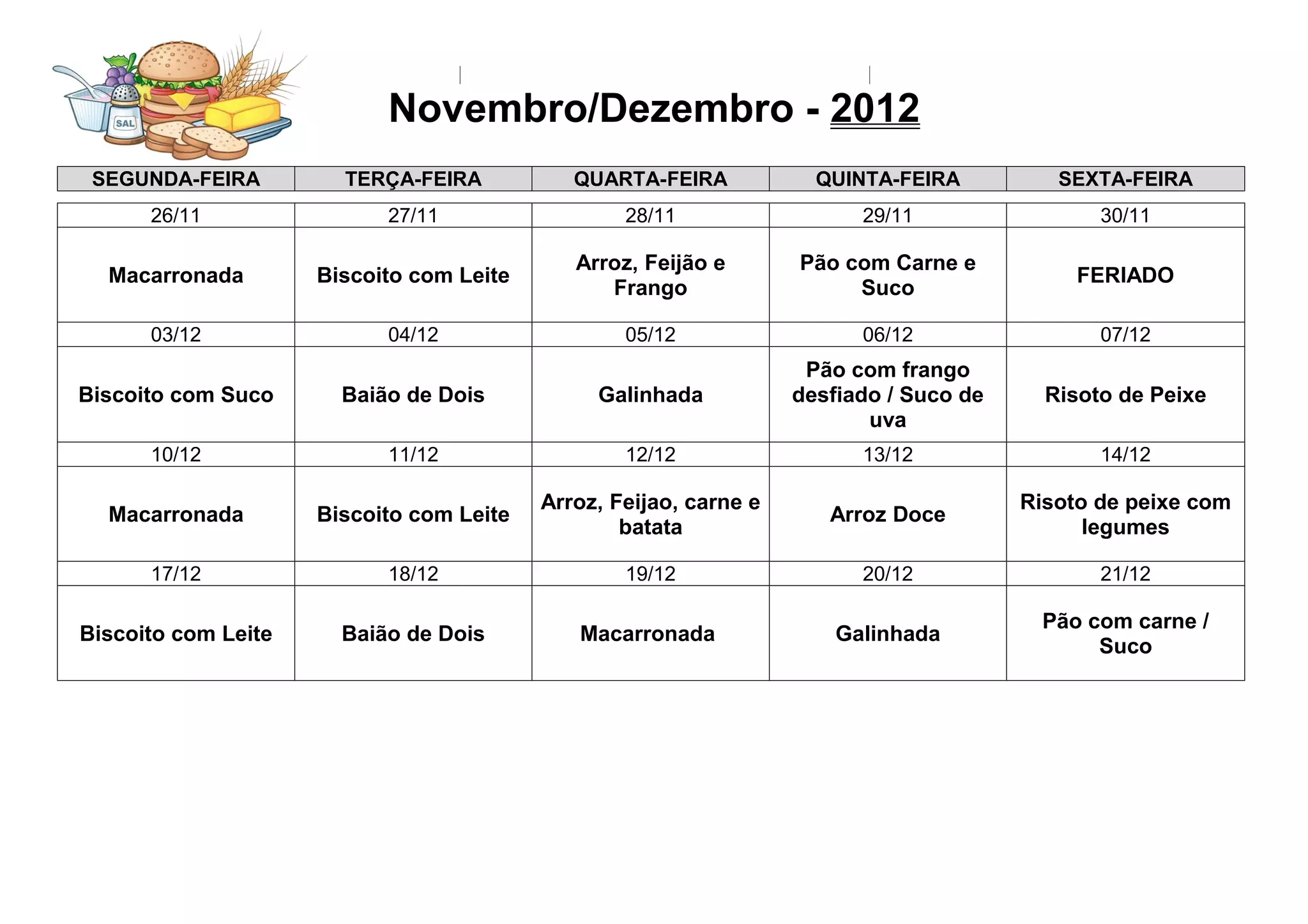 O documento apresenta o cardápio semanal de novembro e dezembro de 2012, com as refeições oferecidas de segunda a sexta-feira, incluindo pratos como macarronada, biscoito com leite, arroz com feijão e frango, e risoto de peixe.