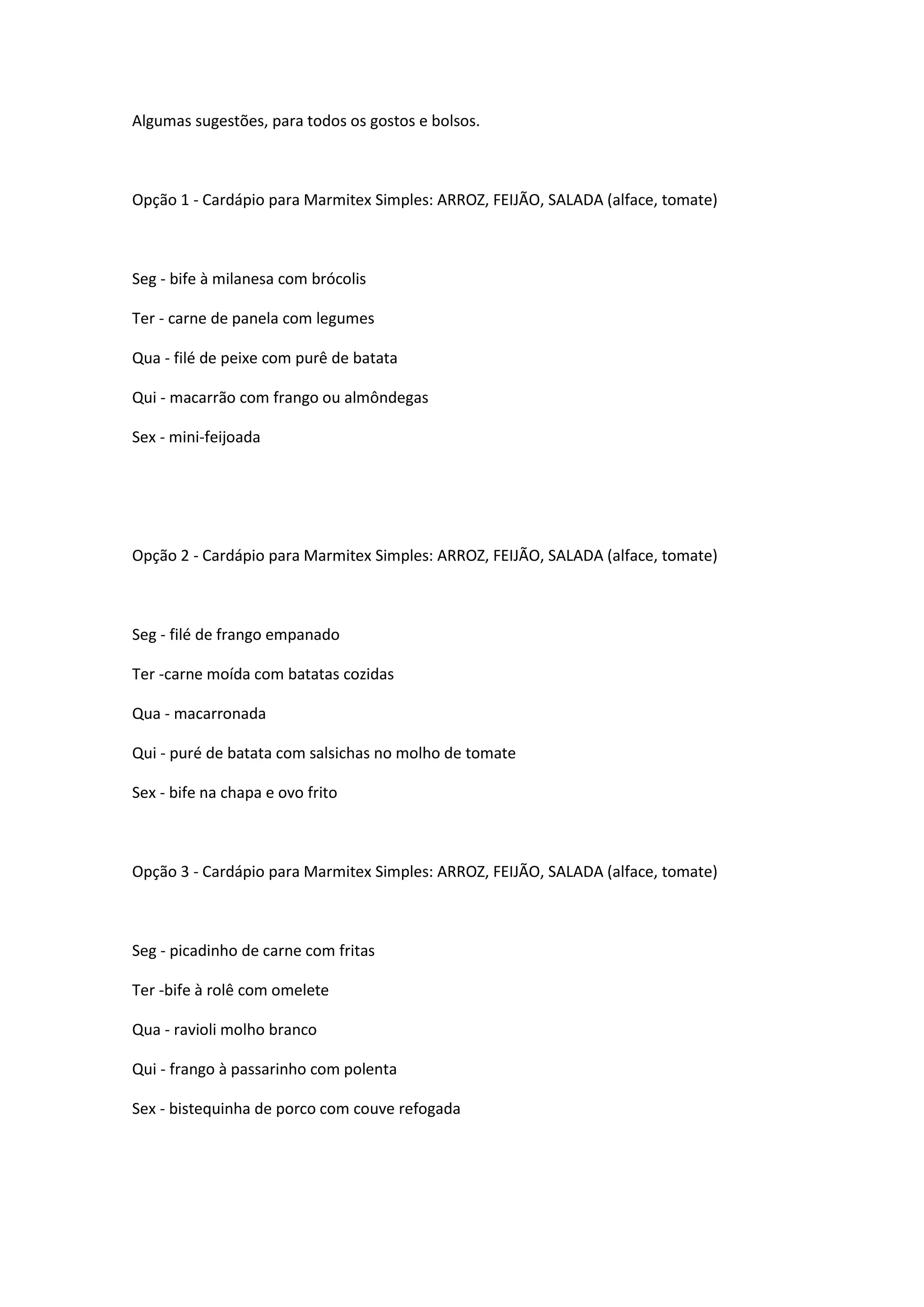O documento apresenta 5 opções de cardápios semanais para marmitas, variando entre opções simples e elaboradas. As opções simples contêm arroz, feijão e salada em todos os dias, com pratos como bife à milanesa, filé de peixe e mini-feijoada. As opções elaboradas substituem o arroz por integral e acrescentam mais tipos de salada e legumes, com sugestões como lasanha de beringela e lentilha, quibe de proteína de soja e peixe grelhado.