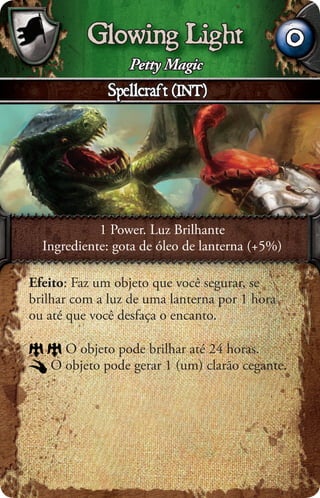 Este documento apresenta vários feitiços de magia menor, incluindo Cantrips (feitiços triviais), Luzes de Marcha (cria luzes flutuantes), Dardos Mágicos (arremessa dardos mágicos), e Mortalha de Sombras (concede ocultação e manobra livre). Os feitiços variam em poder necessário e efeitos, como iluminar objetos, criar sons, induzir quedas ou sono. Muitos requerem ingredientes específicos para o encanto.