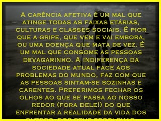 O documento discute os problemas da carência afetiva e solidão na sociedade moderna. Afirma que a indiferença social faz as pessoas se sentirem sozinhas, e que muitos procuram compensação em religiões, internet ou trabalho, sem sucesso. Defende que a solução está em amar e dar carinho aos outros, sem esperar receber, seguindo o exemplo de Jesus que amou até o fim.