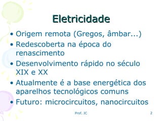 O documento discute os conceitos básicos de eletrostática e processos de eletrização. Ele aborda a origem da eletricidade, os tipos de carga elétrica, e os métodos de eletrização, incluindo atrito, contato e indução. O documento também menciona eletroscópios e como a apresentação pode ser usada como apoio didático sobre o tema de carga elétrica.