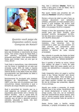 O documento discute os altos impostos sobre produtos consumidos durante o Natal, detalhando as porcentagens aplicadas a itens como chester, panetone e presentes. Além disso, menciona a tradição do 'amigo secreto' como uma forma de reunir a família, enfatizando a importância de estar ciente da carga tributária em compras. O autor, Cristiano Brasil, é um especialista em planejamento financeiro e oferece dicas para economizar.