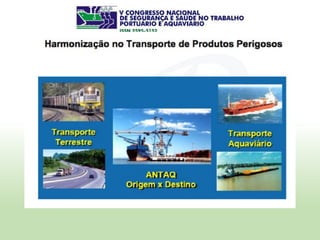 O documento discute a uniformização e atualização do transporte de cargas perigosas nos portos brasileiros. Ele apresenta a necessidade de um sistema único de banco de dados para fornecer informações imediatas sobre cargas perigosas envolvidas em emergências, como detectado após um incêndio no Porto de Santos, e descreve um treinamento realizado pela ANTAQ para capacitar bombeiros e autoridades portuárias no uso deste sistema.