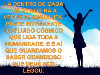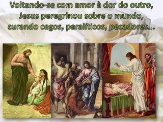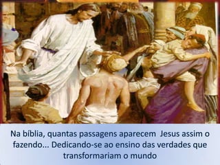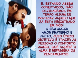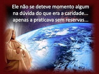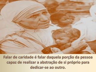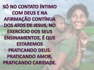 O documento discute a importância da caridade e como podemos praticá-la através de nossas ações e pensamentos. Ele enfatiza que devemos tratar os outros da maneira que gostaríamos de ser tratados e buscar a bondade interior através da oração e autoconhecimento para agir com compaixão no mundo.