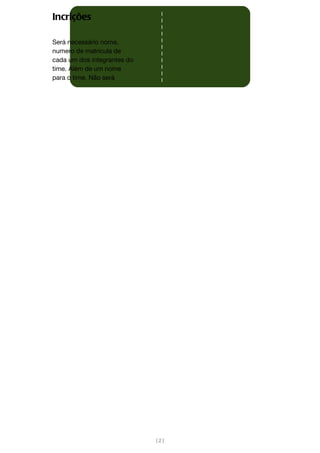 O documento descreve as regras de um torneio de dodgeball organizado pela Coordenadoria de Esportes do CAAMB. Cada time terá seis jogadores que tentarão acertar os jogadores da equipe adversária com bolas. Os jogadores serão eliminados se forem acertados abaixo do ombro ou se deixarem a bola ser segurada por mais de dois segundos. A equipe vencedora será a última com jogadores restantes. Medalhas serão distribuídas aos vencedores.