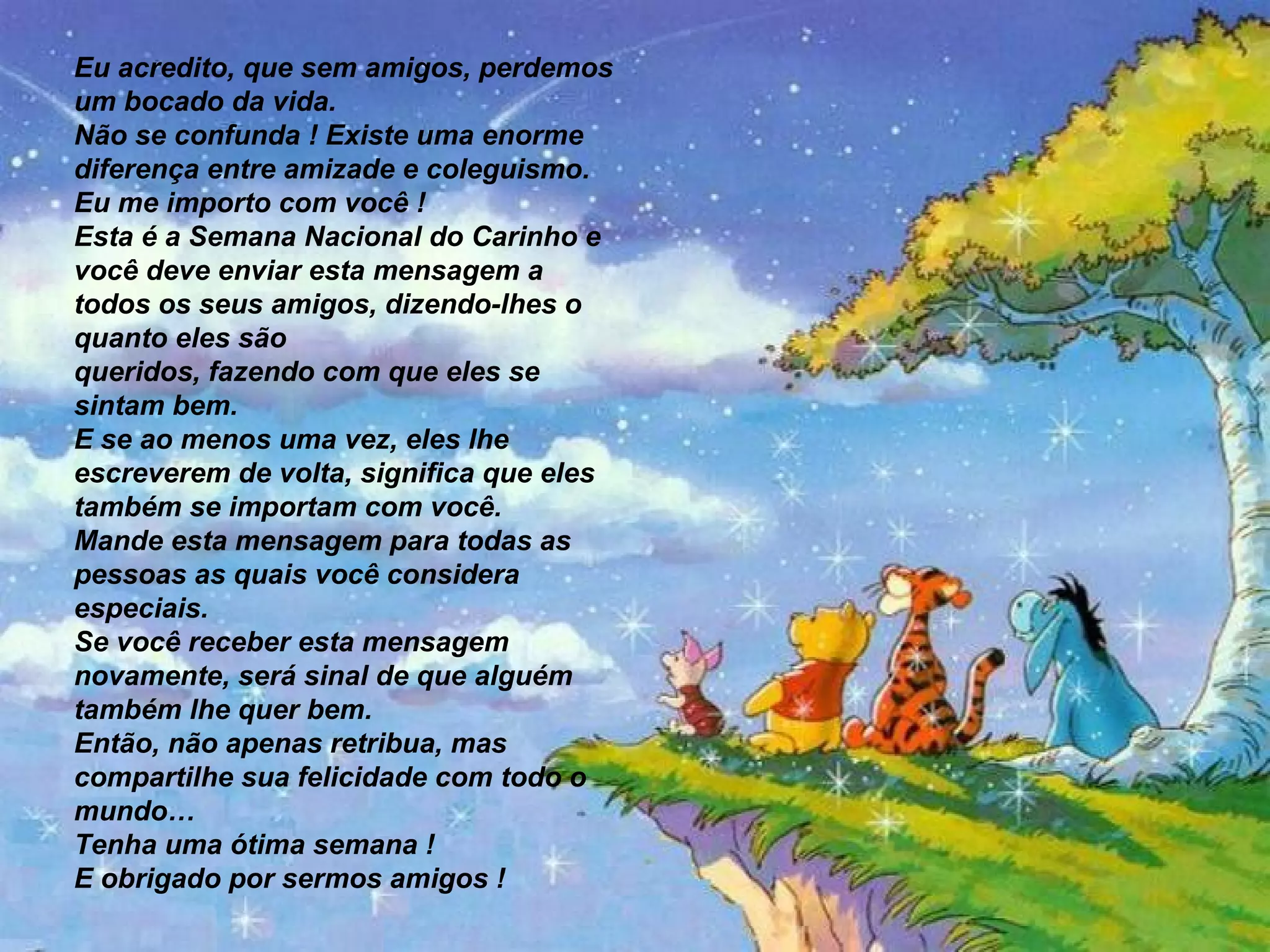 O documento discute a importância da amizade e encoraja as pessoas a enviarem mensagens para amigos dizendo o quanto eles são queridos durante a Semana Nacional do Carinho. Ele também sugere que se as pessoas receberem de volta uma mensagem, significa que os outros também se importam com eles.