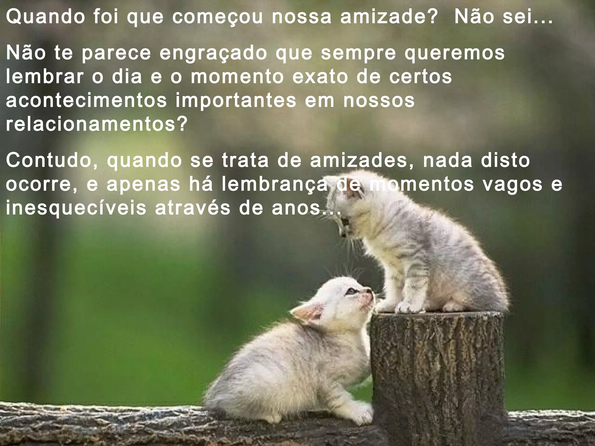 Quando foique começou nossa amizade? Não sei... Não te parece engraçado que sempre queremos lembrar o dia e o momento exato de certos acontecimentos importantes em nossos relacionamentos? Contudo, quando se trata de amizades, nada disto ocorre, e apenas há lembrança de momentos vagos e inesquecíveis através de anos...