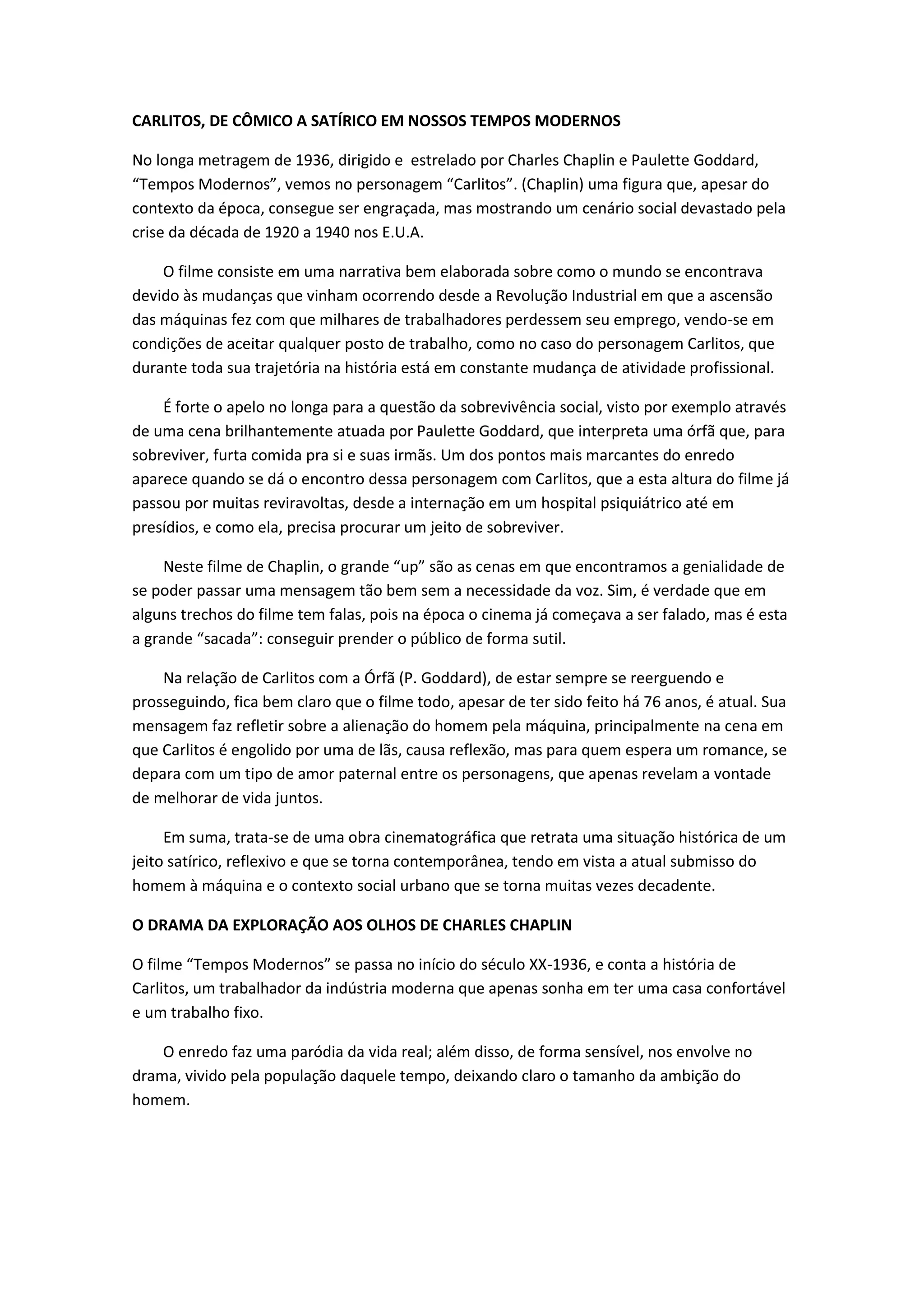 O filme "Tempos Modernos" (1936), dirigido e protagonizado por Charles Chaplin, retrata de forma cômica e crítica a dura realidade dos trabalhadores nos Estados Unidos durante a Grande Depressão, mostrando as dificuldades enfrentadas pelo personagem Carlitos em conseguir e manter um emprego em meio à crise e à automação do trabalho. A obra utiliza a comédia para abordar temas sociais importantes de forma sutil e ainda atual.