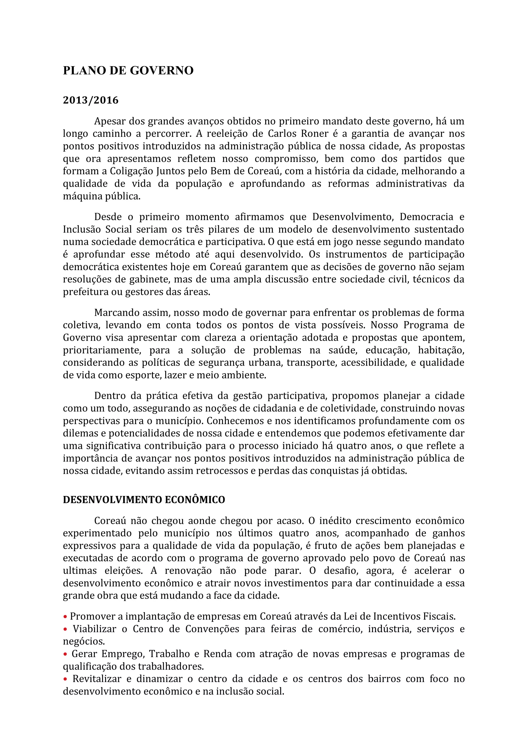 O documento apresenta o plano de governo para o período de 2013 a 2016 do prefeito Carlos Roner. Os principais pontos são: aprofundar os pilares do desenvolvimento, democracia e inclusão social; promover o desenvolvimento econômico atraindo novos investimentos; e ampliar programas de inclusão social, educação, assistência social e esporte.