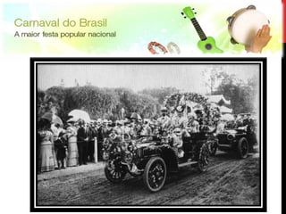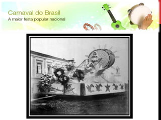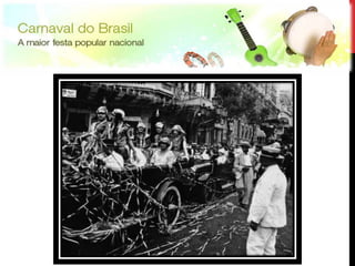 O documento descreve a história do carnaval no Brasil, desde suas origens no entrudo português até se tornar uma das maiores festas populares do país. O carnaval foi influenciado pelas tradições européias e foi crescendo no Brasil ao longo dos séculos XIX e XX com a popularização de blocos, escolas de samba e trios elétricos.