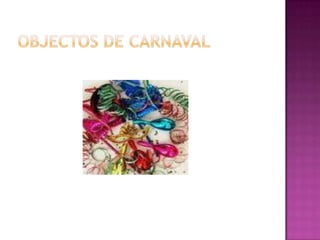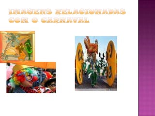 O documento descreve o que é o Carnaval, onde é celebrado, o que constitui as festividades do Carnaval e fornece algumas ideias de brincadeiras para serem feitas em casa durante o Carnaval.