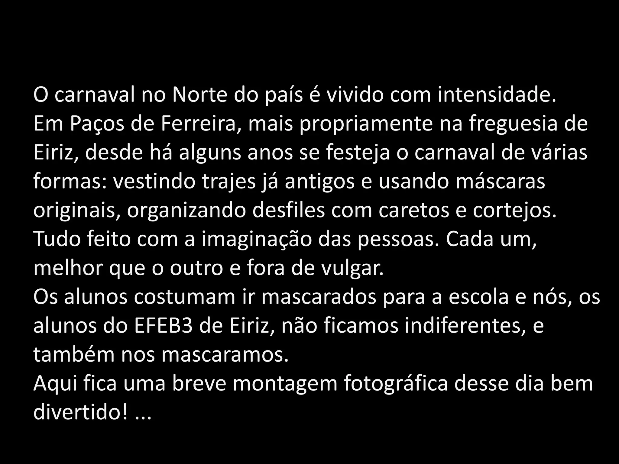 O carnaval é celebrado em Eiriz, Paços de Ferreira, com trajes e máscaras tradicionais em desfiles e cortejos. Os alunos da escola local costumam ir mascarados para a escola, incluindo os alunos do 3o ano do Ensino Fundamental que se juntaram às festividades e tiraram fotos da sua experiência.