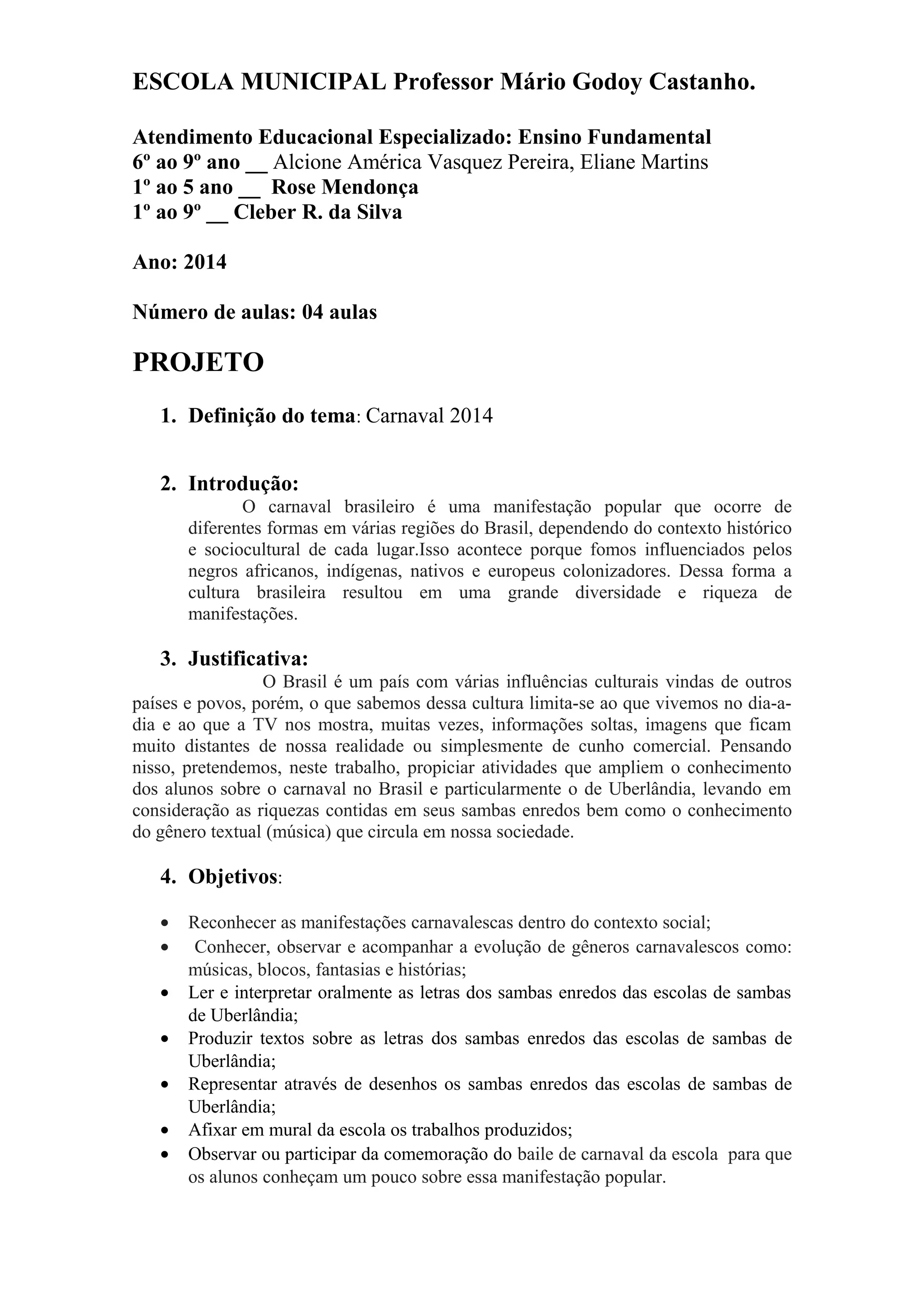 Este projeto visa ensinar aos alunos sobre as manifestações do carnaval brasileiro, especialmente em Uberlândia, através de atividades como ouvir sambas enredos, ler letras, fazer desenhos e máscaras, e participar de um baile. Os objetivos incluem reconhecer o contexto social do carnaval e conhecer a evolução de gêneros como músicas e fantasias. A avaliação será contínua com base na observação e produção de registros visuais e textuais pelos alunos.