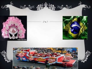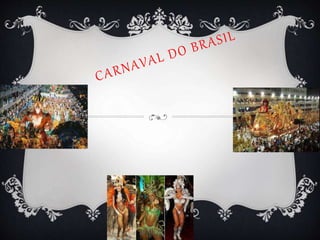 O documento descreve como o Carnaval é comemorado em diferentes lugares. Tradicionalmente, marca o "adeus à carne" antes do período de jejum da Quaresma, tendo suas origens na Grécia antiga e sendo adotado pela Igreja Católica. Hoje, é caracterizado por desfiles e fantasias, com destaque para os carnavais do Rio de Janeiro, inspirador de outras cidades, e de Podence, onde figuras tradicionais saem às ruas.