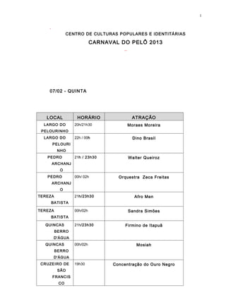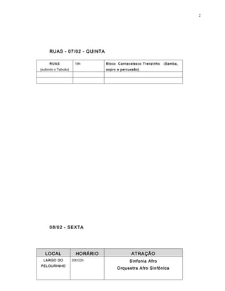 O documento lista as atrações musicais e blocos de rua que se apresentarão no Carnaval do Pelô em Salvador entre os dias 07 a 12 de fevereiro. Haverá shows em locais como o Largo do Pelourinho, Pedro Archanjo, Tereza Batista e Quincas Berro D'Água, com gêneros como samba, reggae, frevo e orquestras. Blocos de rua desfilarão pelas ruas do Centro Antigo.
