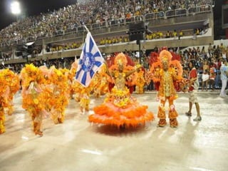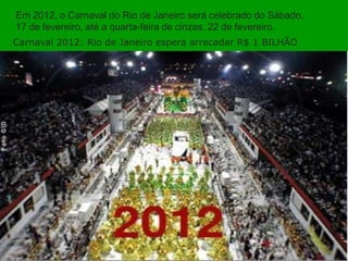 O documento resume os principais detalhes do Carnaval do Rio de Janeiro em 2012, incluindo as datas (17 a 22 de fevereiro), a expectativa de arrecadação de R$1 bilhão, e os temas e rainhas de bateria das 15 escolas de samba que desfilariam nos dias 19 e 20 de fevereiro.