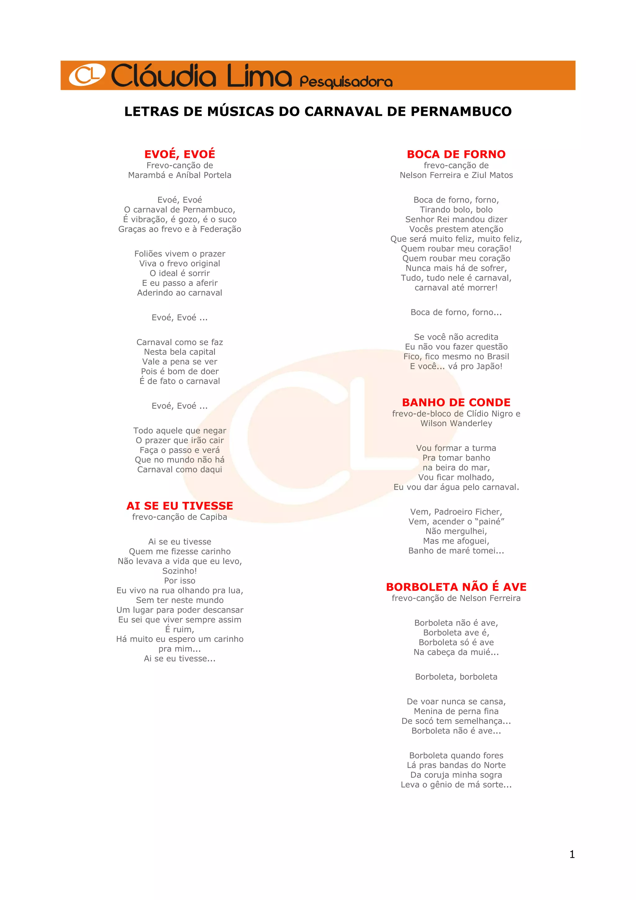 Este documento apresenta letras de músicas tradicionais do carnaval de Pernambuco. As letras celebram a alegria, a cultura e as tradições do carnaval pernambucano, descrevendo ritmos como o frevo e marchinhas de blocos carnavalescos. Muitas letras também evocam a saudade dos carnavais passados e homenageiam figuras importantes da cultura carnavalesca de Pernambuco.