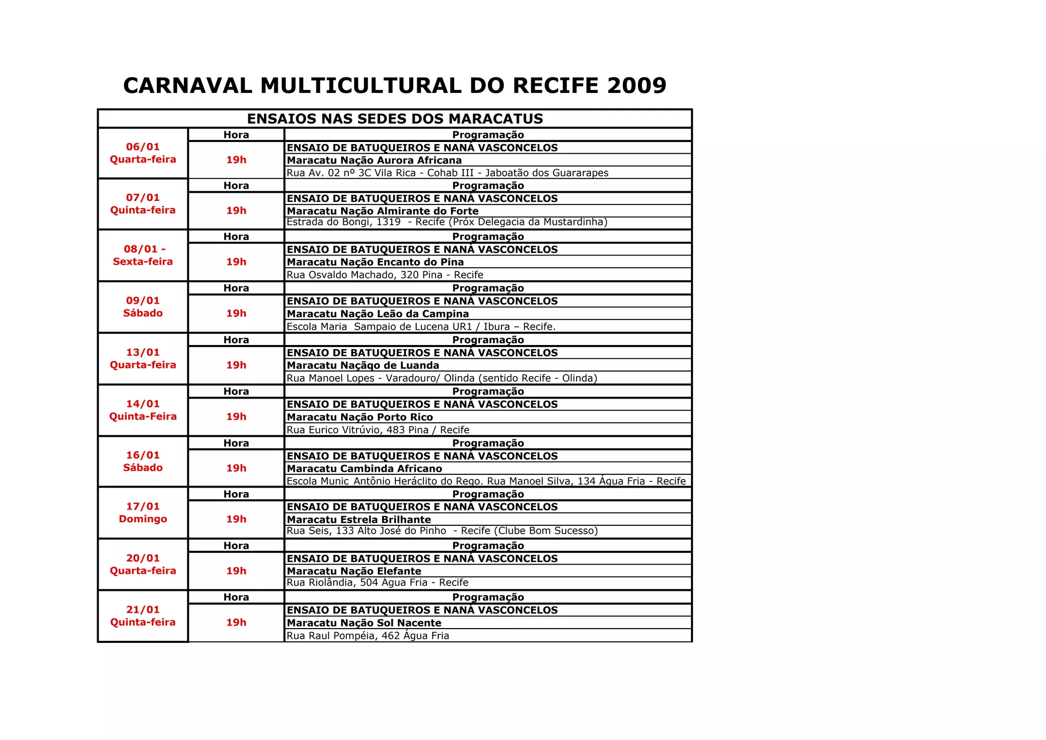 O documento lista os ensaios de vários maracatus e blocos de afoxé e escolas de samba que ocorrerão em janeiro e fevereiro de 2009 no Carnaval Multicultural do Recife. Os ensaios acontecerão nas sedes dos maracatus e no Pátio de São Pedro e contarão com a participação do músico Naná Vasconcelos.