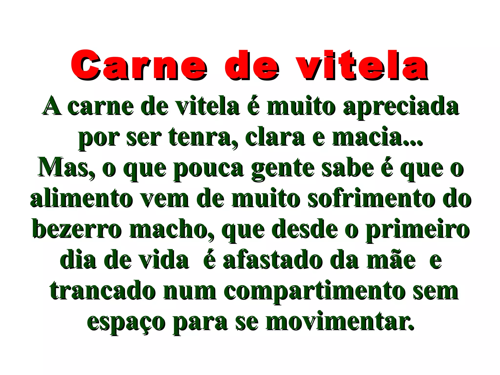 A produção de carne de vitela envolve o confinamento de bezerros em espaços apertados, separação precoce das mães e alimentação restrita para manter a carne macia. Os bezerros sofrem privação de movimento, luz e ferro em sua dieta para engorde rápido antes do abate aos 4 meses de idade. O documento defende o boicote a este tipo de carne para evitar o sofrimento animal.