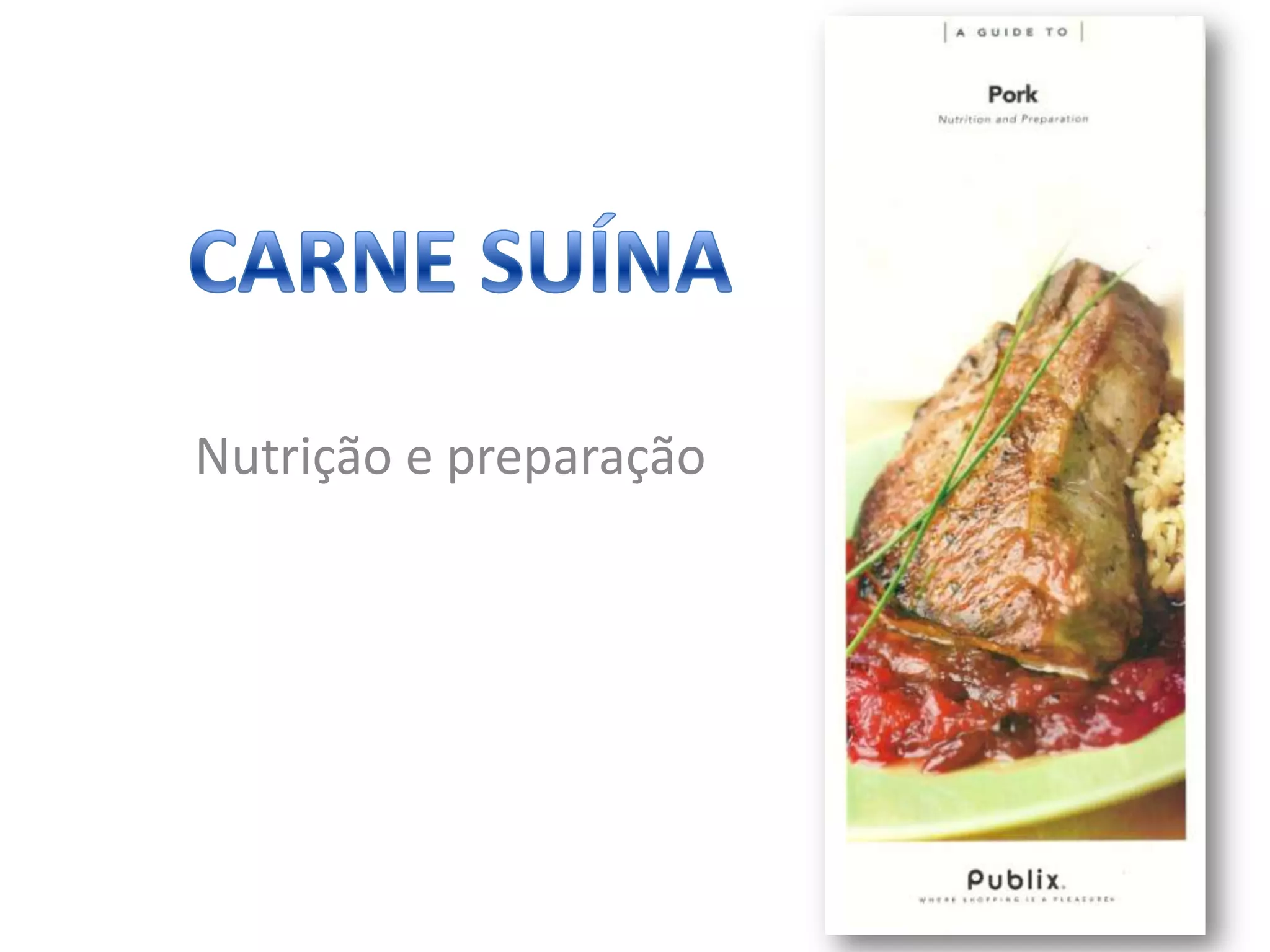 Este documento fornece instruções sobre a preparação e armazenamento seguros de carne suína, incluindo marinar a carne coberta na geladeira, usar carne fresca dentro de 3-5 dias e lavar as mãos e superfícies antes de manipular alimentos. Também fornece tabelas sobre cortes de carne suína com tempo de cozimento e informações nutricionais como calorias e teor de gordura.