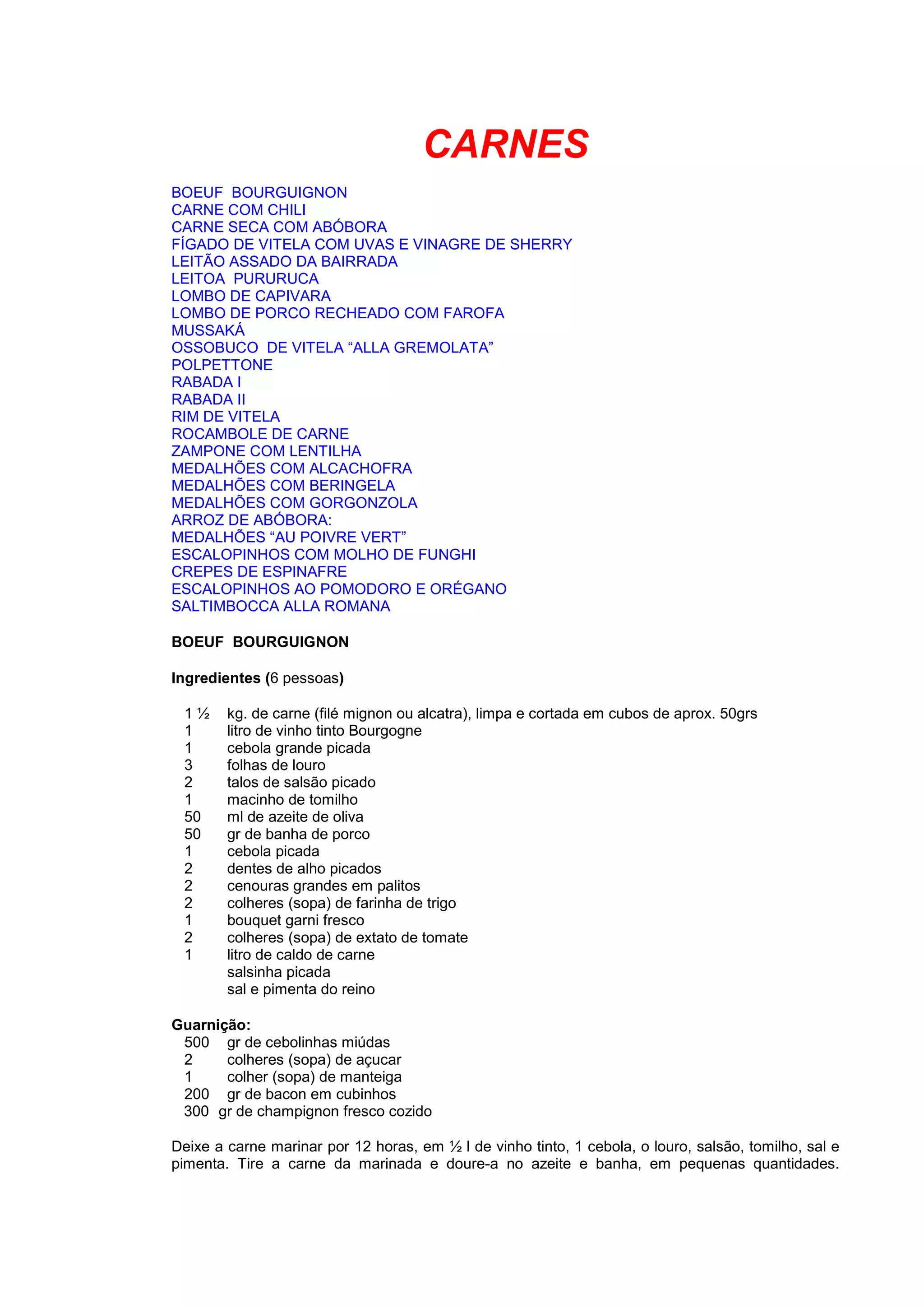 O documento fornece receitas de diferentes carnes, incluindo boeuf bourguignon, carne com chili, e carne seca com abóbora. Menciona também pratos como fígado de vitela com uvas, leitão assado, e lombo de capivara. Fornece instruções de preparo detalhadas para vários pratos.
