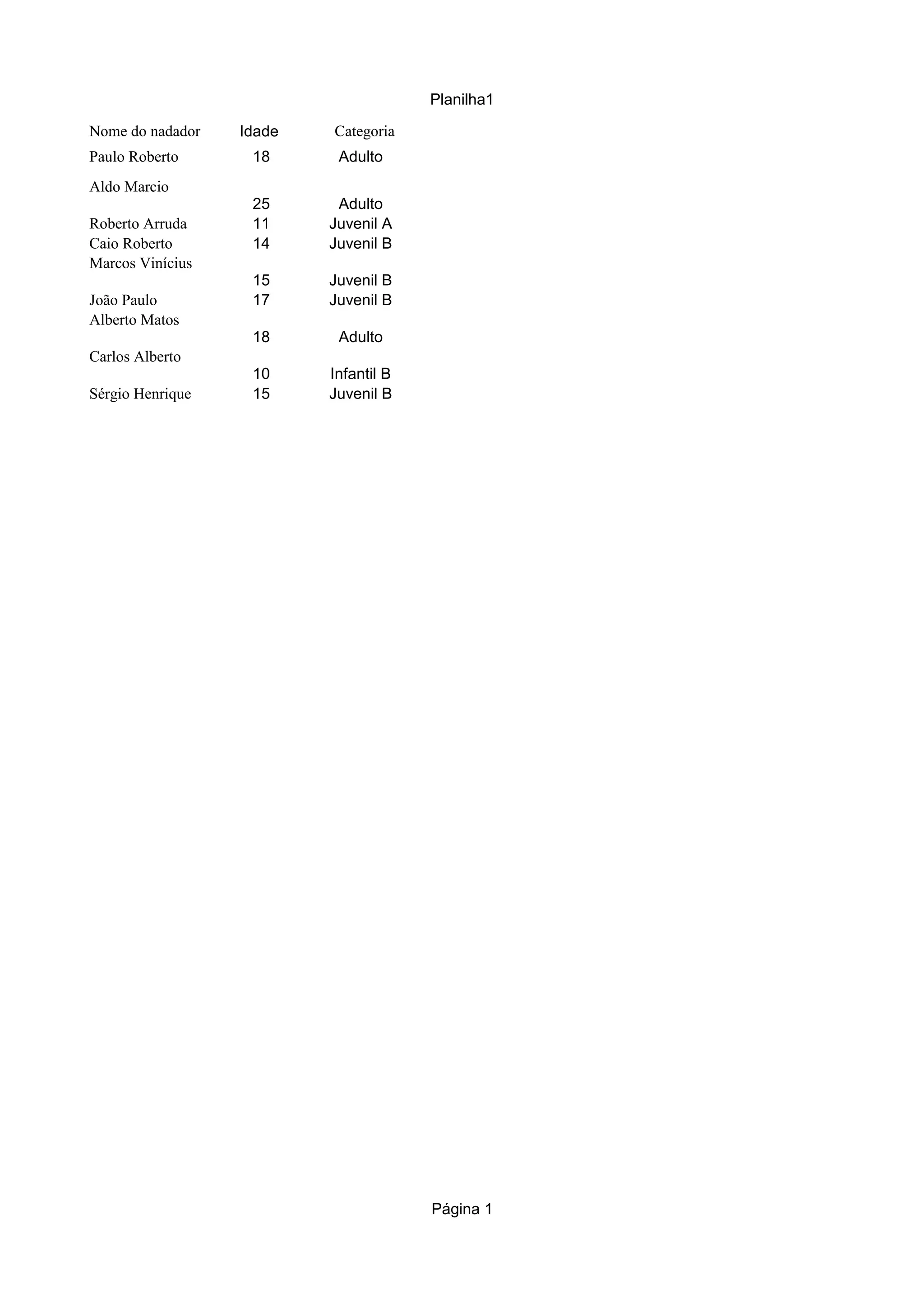 Nome do nadador Idade Categoria