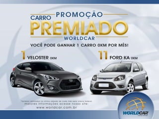 O documento promove um serviço de aluguel de carro reserva chamado WorldCar para casos de acidentes, roubo ou pane no veículo do cliente. O serviço fornece um carro de aluguel por até 7 dias em todo o território nacional por R$149 ou 12 parcelas de R$14,90. Os clientes também podem participar de sorteios mensais de carros 0km.