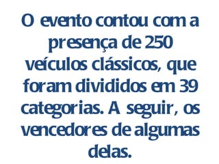 O documento lista os vencedores de 39 categorias de um concurso de elegância de veículos clássicos realizado em Amelia Island em março de 2011, incluindo categorias como "Clássico Americano Fechado", "Duesenberg", "Mercedes-Benz Pós-Guerra" e "Carros Esportivos Pré-Guerra". O prêmio máximo, "Best of Show", foi para um Duesenberg SJN Arlington Torpedo Sedan de 1933.