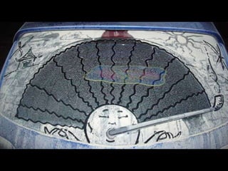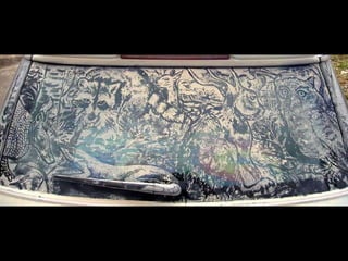 O documento descreve o que Scott Wade faz quando encontra um carro com o vidro sujo. Ele faz desenhos artísticos nos vidros usando o dedo, copiando obras famosas como "A Friend in Need" e sobrepondo "Mona Lisa" em cima de "Starry Night".