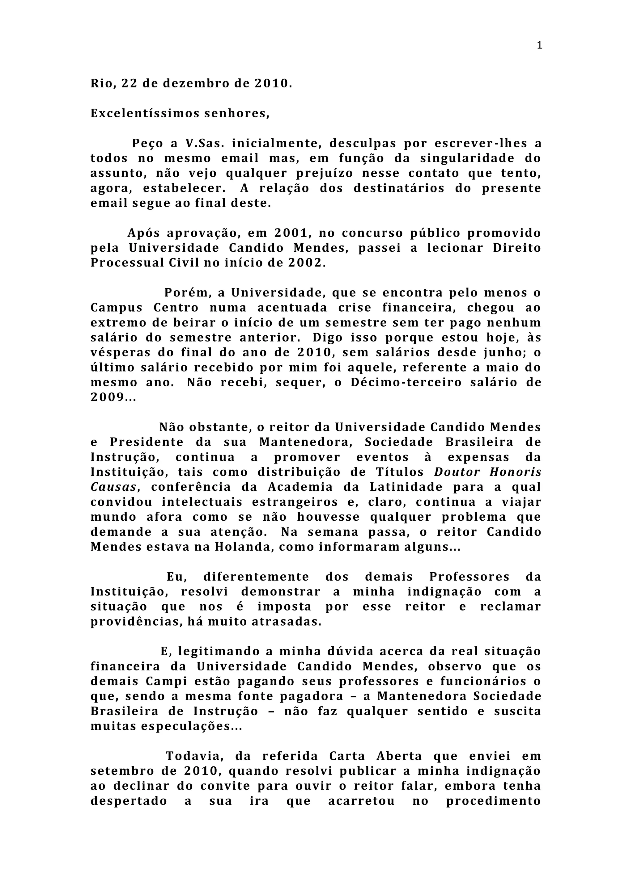 O professor Carlos Magno Siqueira Melo enviou uma carta a vários senhores explicando sua situação na Universidade Candido Mendes. Ele não recebe salários desde junho de 2010 e o reitor continua promovendo eventos caros em vez de pagar os funcionários. Apesar de tentar abrir os olhos do reitor, ele parece não se importar com os funcionários que estão passando necessidades. O professor anexou três emails anteriores enviados ao reitor para demonstrar a situação crítica.