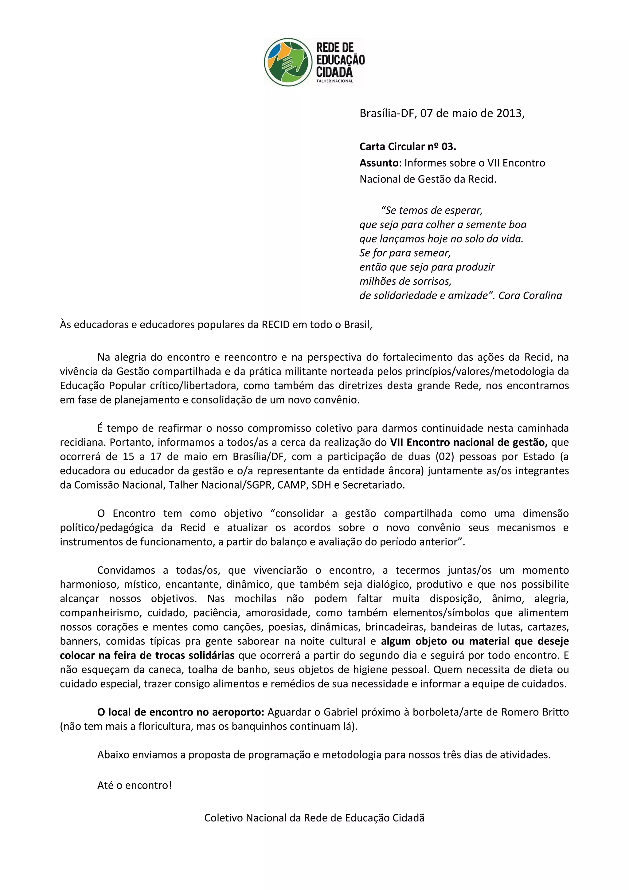 1) O documento convida os educadores populares da Rede de Educação Cidadã (RECID) para o VII Encontro Nacional de Gestão, que ocorrerá em Brasília entre os dias 15 e 17 de maio.
