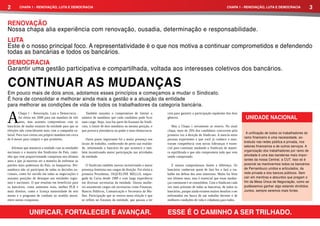 A chapa 1 propõe sua candidatura para as eleições sindicais com propostas como mais e melhores empregos, melhores condições de trabalho e saúde, luta contra o assédio moral e mais segurança. A chapa também apresenta seus candidatos, que representam funcionários de todos os principais bancos que atuam em Pernambuco.