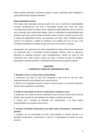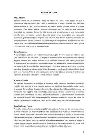 Este documento apresenta os princípios da Carta da Terra, que defende a necessidade de uma aliança global para cuidar do planeta e uns dos outros de forma sustentável. O documento propõe quatro compromissos principais: respeitar a comunidade da vida, proteger a integridade ecológica, promover justiça social e econômica, e fortalecer a democracia, a não violência e a paz. A Carta da Terra visa estabelecer valores compartilhados para guiar as ações rumo a um modo de vida sustent