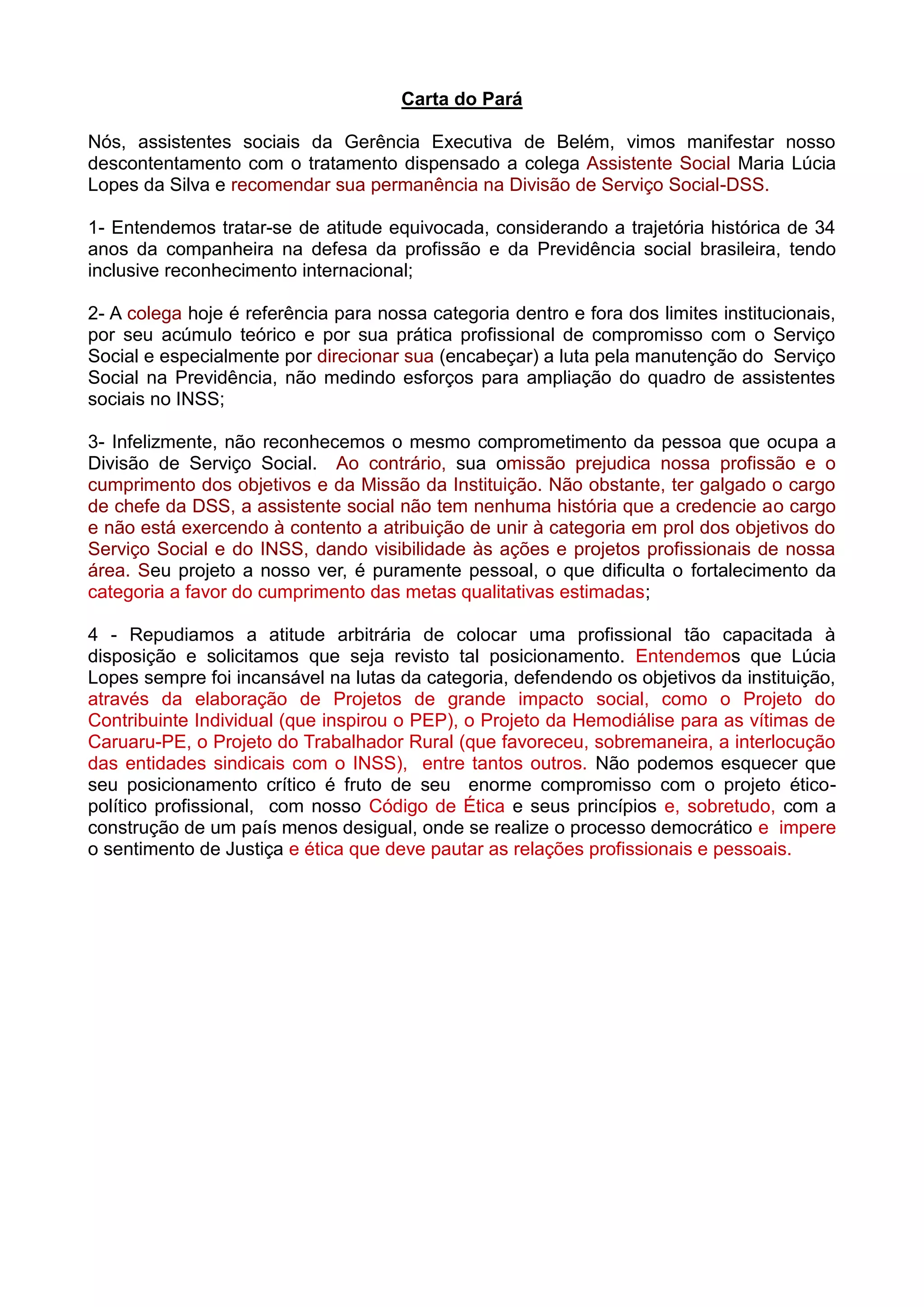 A carta expressa descontentamento com a transferência da assistente social Maria Lúcia Lopes da Silva da Divisão de Serviço Social. Eles argumentam que ela tem 34 anos de experiência defendendo a profissão e a previdência social brasileira. Eles também afirmam que a atual chefe da divisão não tem experiência comparável e não está unindo a categoria para cumprir os objetivos do serviço social e do INSS. Eles solicitam que a transferência de Maria Lúcia seja revista.