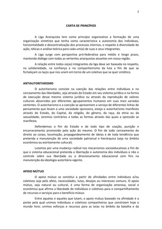 A Liga Anarquista surgiu de conversas entre anarquistas individuais após os protestos de 2013 no Rio de Janeiro. O objetivo da Liga é promover a autodefesa mútua, solidariedade e ação direta entre anarquistas de forma descentralizada e respeitando a diversidade. A Liga defende cinco princípios: anti-autoritarismo, autogestão, ação direta, federalismo e apoio mútuo.