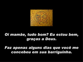 Oi mamãe, tudobom? Eu estou bem, graças a Deus. Faz apenas alguns dias que você me concebeu em sua barriguinha.