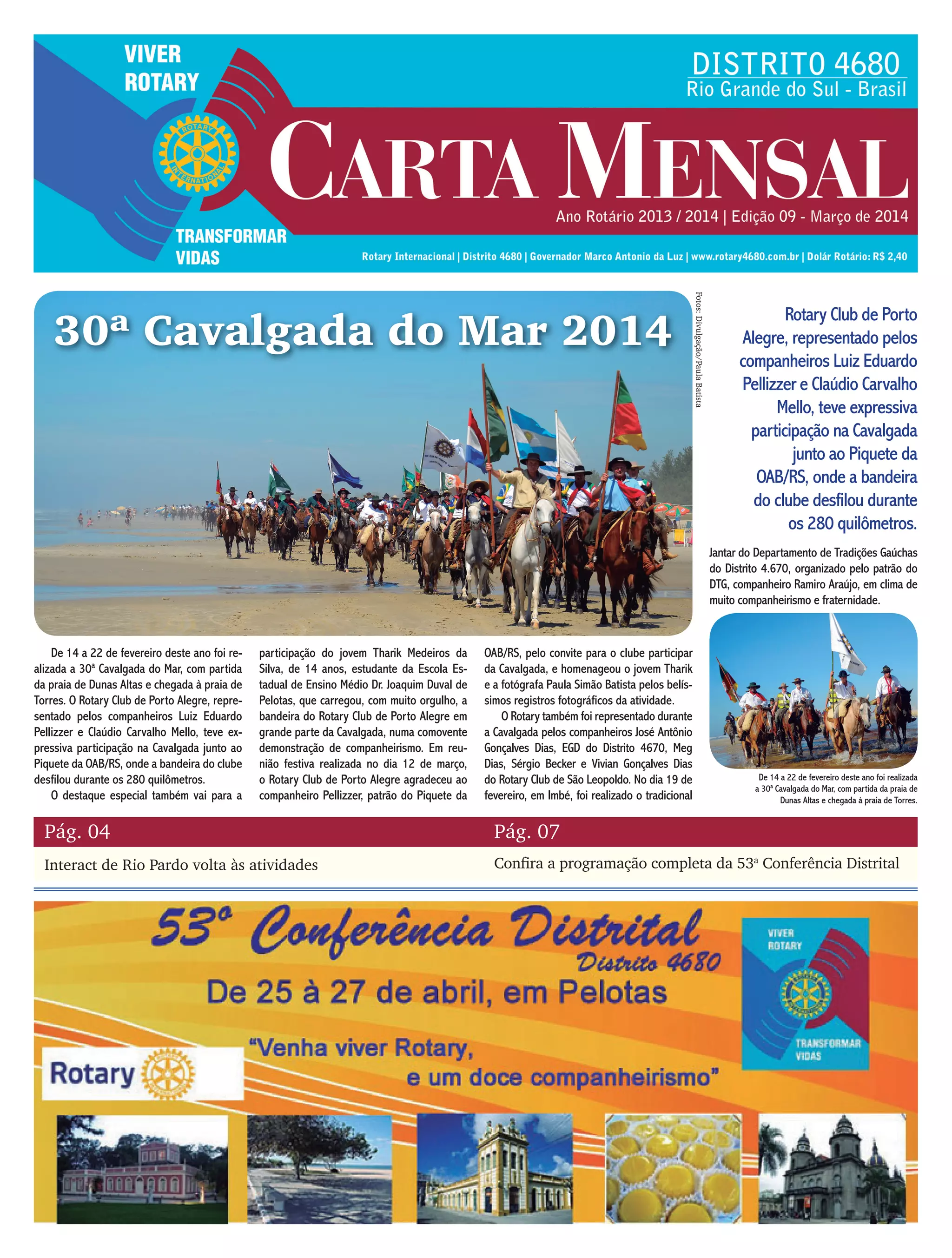 O documento relata a participação do Rotary Club de Porto Alegre na 30a Cavalgada do Mar, com a bandeira do clube desfilando durante os 280 quilômetros do percurso. Também destaca a participação do jovem Tharik Medeiros da Silva, de 14 anos, que carregou a bandeira do clube durante grande parte do evento.