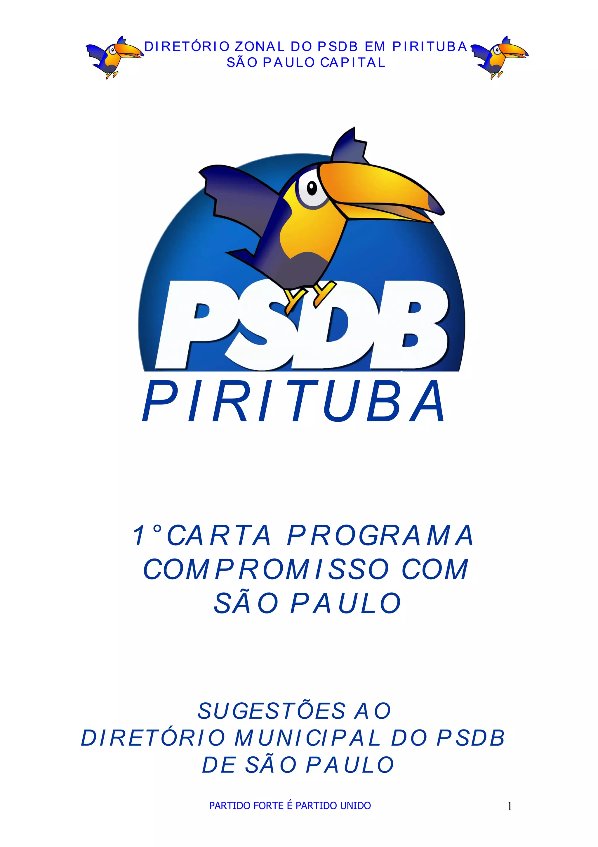 O documento apresenta as diretrizes e compromissos do diretório zonal do PSDB em Pirituba para fortalecer a atuação política e administrativa do partido nas eleições de 2012. Destaca a importância da participação democrática, da descentralização administrativa e da luta por direitos sociais, com propostas específicas em diversas áreas, como saúde, educação, mobilidade urbana e igualdade racial. Além disso, reafirma a necessidade de ouvir as demandas da população e construir uma plataforma programática que reflita as aspirações sociais.