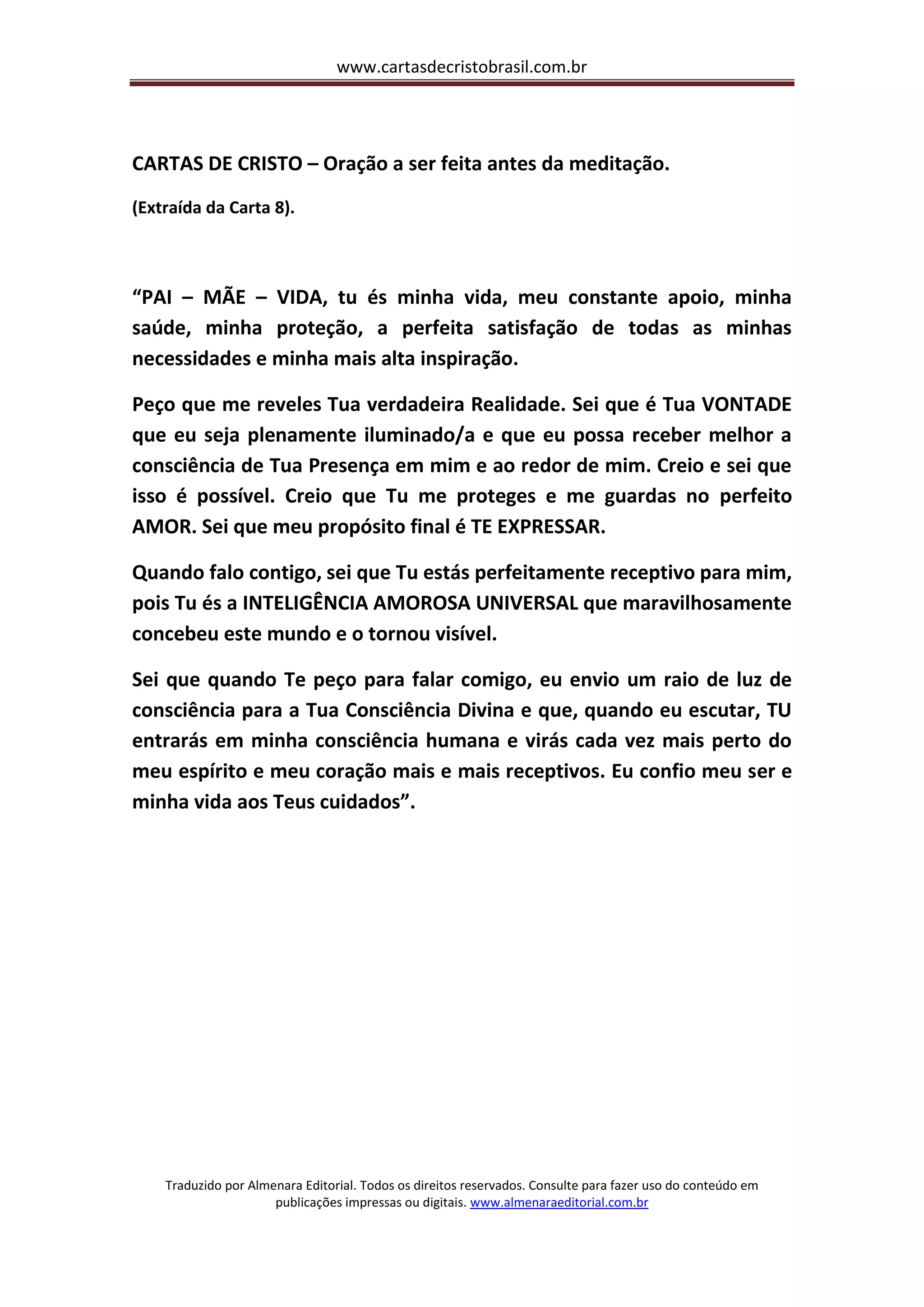 Esta oração pede a Deus que revele sua verdadeira natureza ao orante e que o ilumine completamente. Ela expressa a crença de que Deus é a inteligência amorosa universal que protege a todos no amor perfeito e que o propósito final do orante é expressar esse amor divino. A oração pede a Deus que fale com o orante e entre em sua consciência humana à medida que ele se torna mais receptivo.