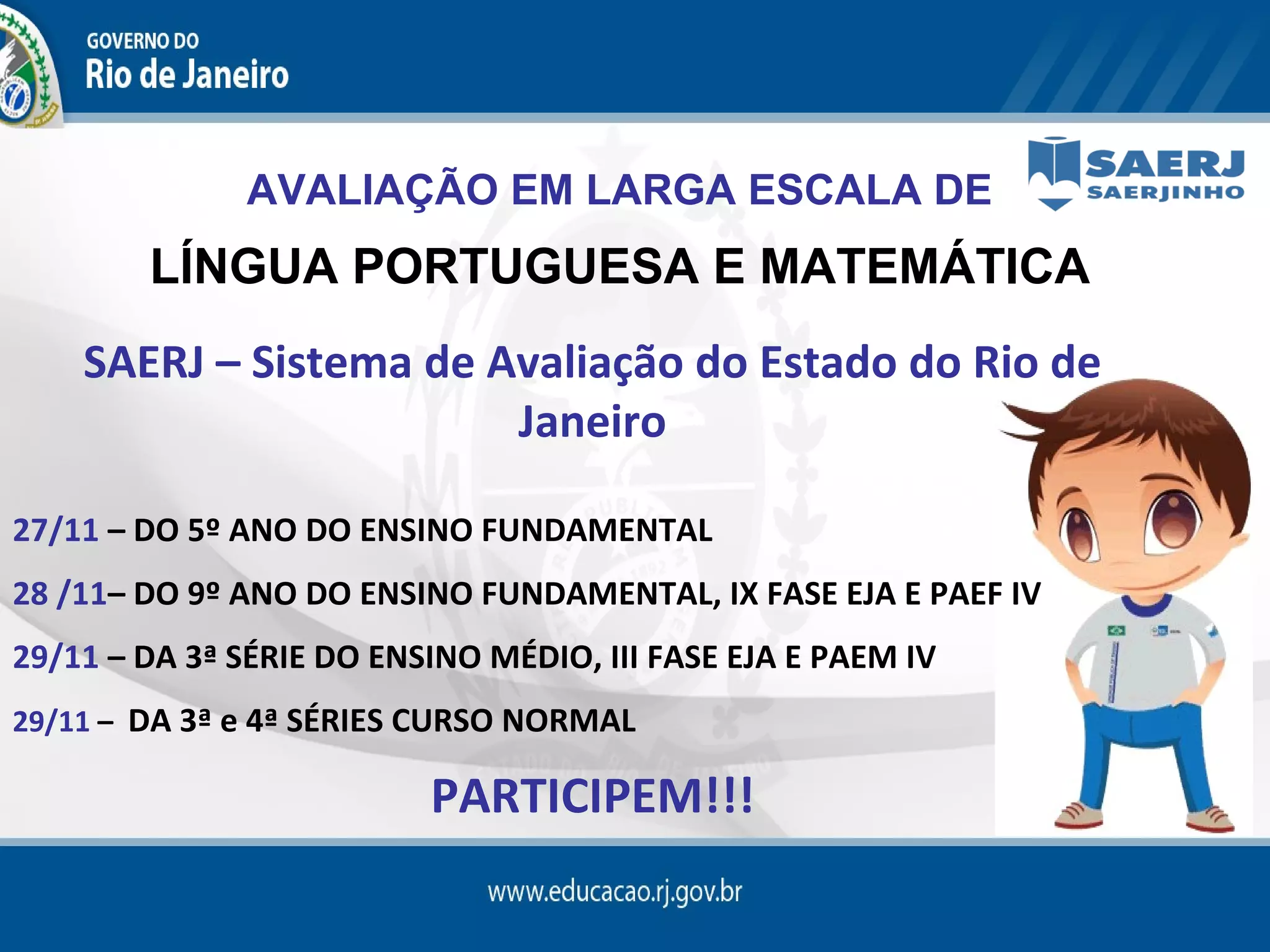 O documento anuncia as datas para a Avaliação em Larga Escala de Língua Portuguesa e Matemática do SAERJ para alunos do 5o ano do Ensino Fundamental em 27 de novembro, do 9o ano do Ensino Fundamental, IX Fase EJA e PAEF IV em 28 de novembro e da 3a Série do Ensino Médio, III Fase EJA e PAEM IV em 29 de novembro, convidando os alunos a participarem.