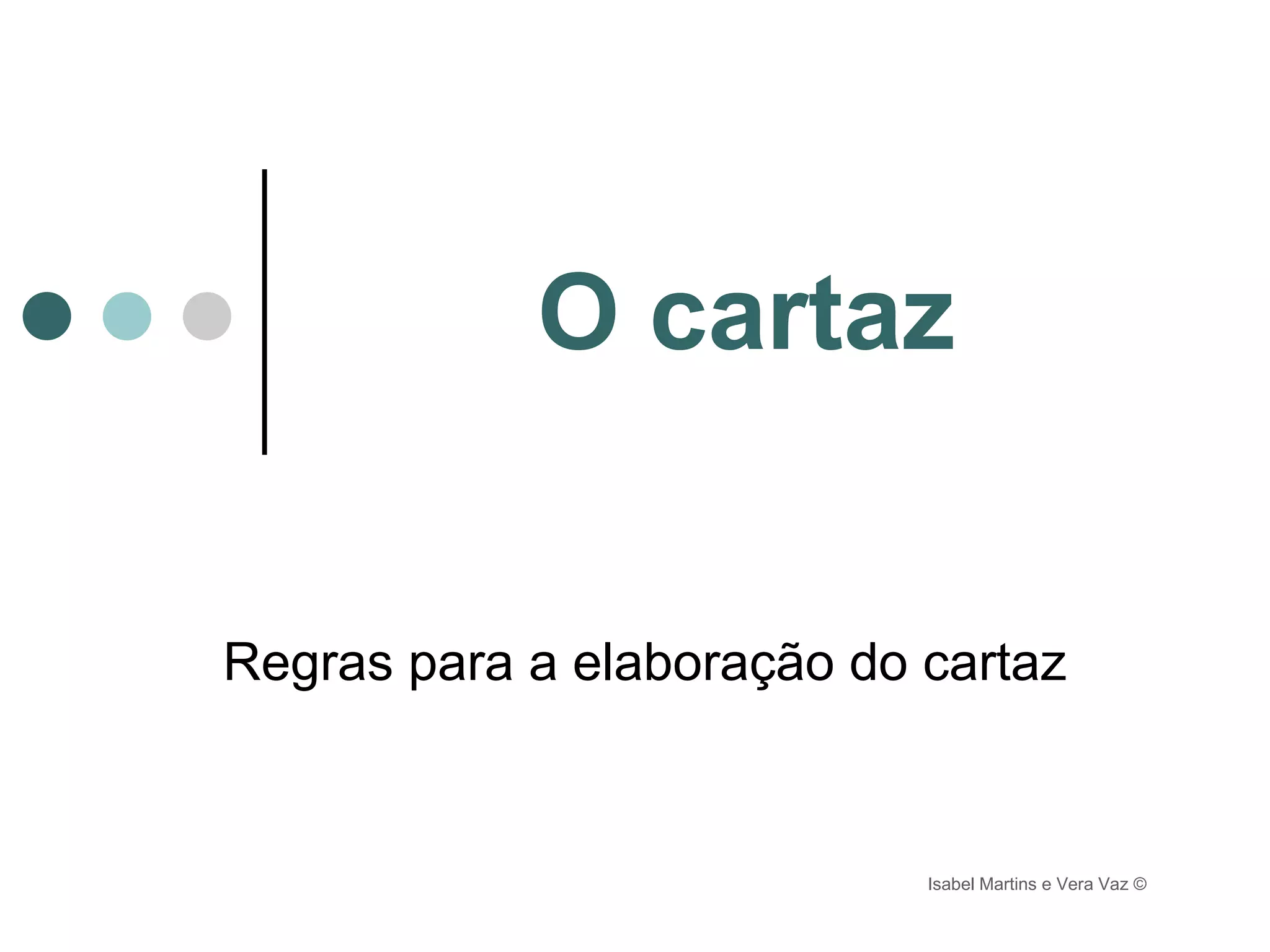 O documento fornece diretrizes para criar cartazes eficazes, incluindo atrair a atenção do observador imediatamente através da relação entre texto e imagem, ter um ponto central óptico acima do centro geométrico, e seguir regras como usar uma forma retangular, imagem e mensagem simples, texto curto e legível, e organização simples dos elementos.